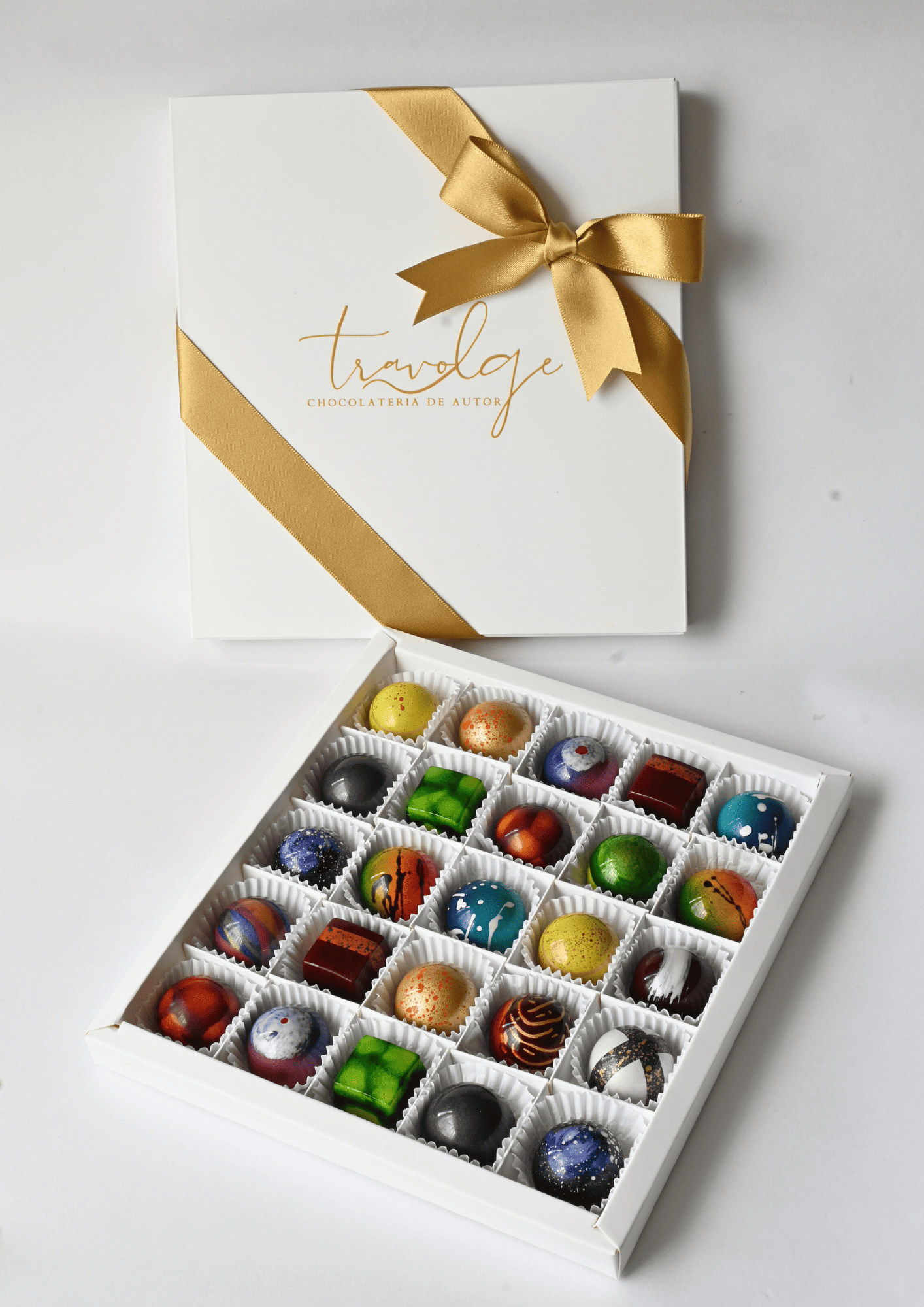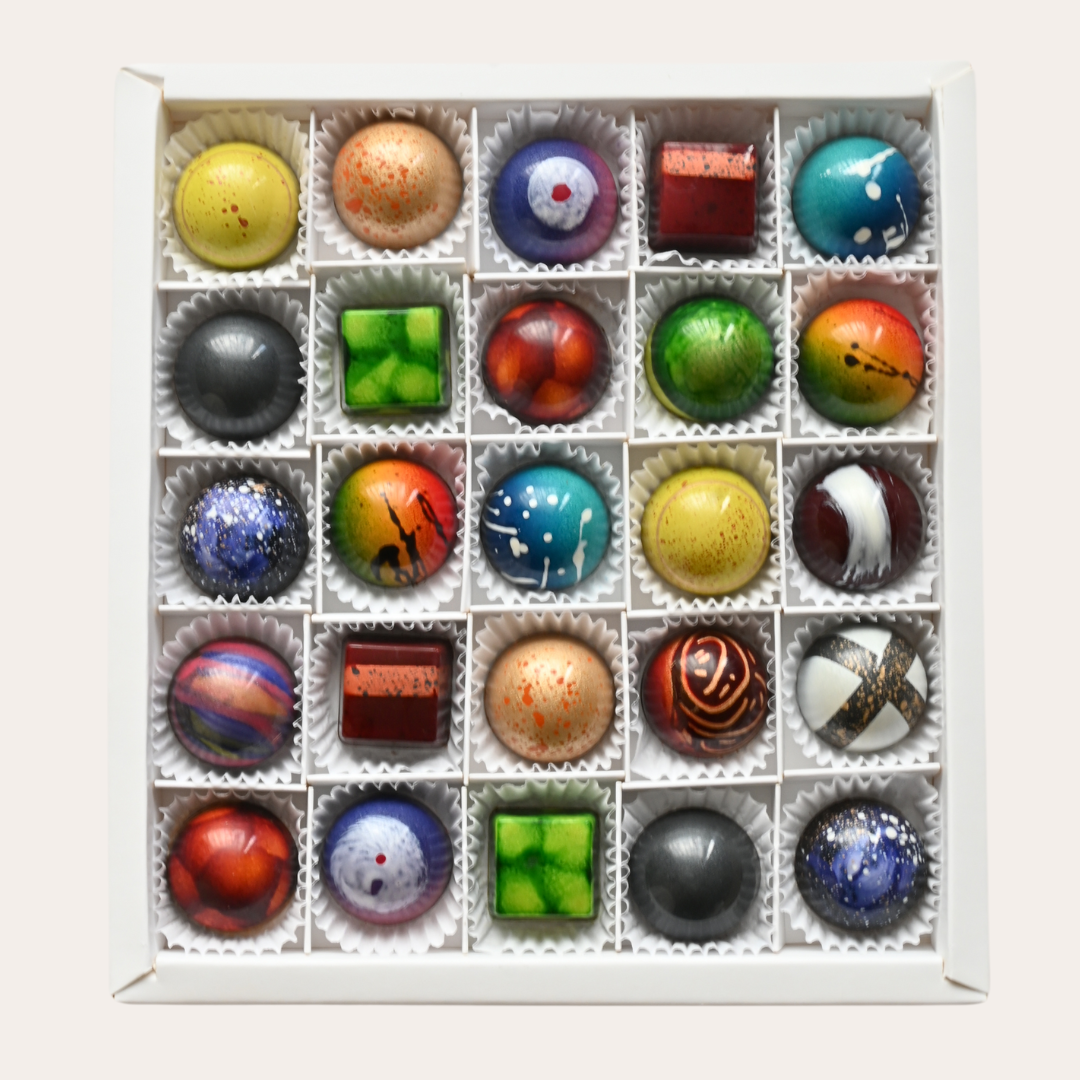 Descubre la exquisita caja de 25 bombones de chocolate de lujo, donde puedes elegir hasta 15 sabores únicos y exclusivos. Cada bombón es una obra de arte de autor, elaborada con ingredientes de la más alta calidad, que promete deleitar tus sentidos. El empaque es elegante y sofisticado, ideal para regalar o disfrutar en ocasiones especiales, y viene acompañado de una tarjeta personalizada que añade un toque especial a tu elección.